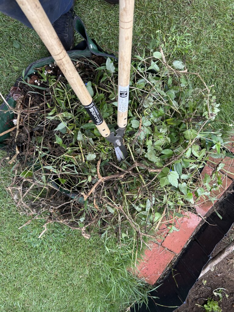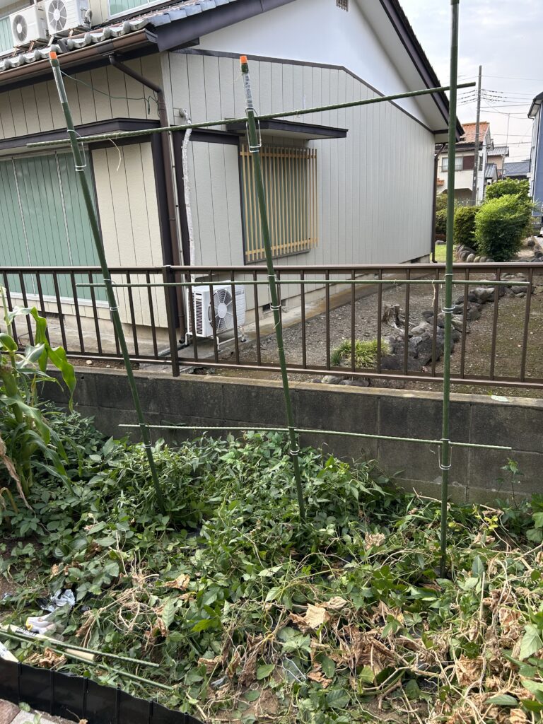 夏の間、つるを支えてくれた支柱も片付けました。 - 葉っぱや茎を細かくカット